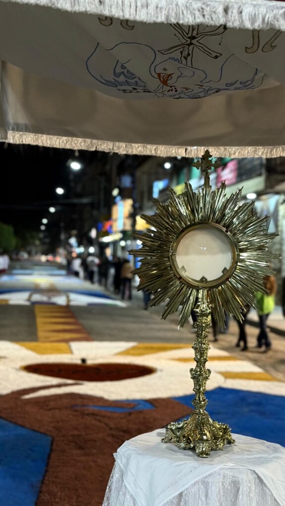 Santuário celebra Corpus Christi com fé, alegria e testemunho público A Solenidade de Corpus Christi foi celebrada com profunda reverência e devoção no Santuário. Pela manhã, a Santa Missa foi presidida pelo Padre Jorge Eduardo e concelebrada pelo pároco e reitor, Pe. Higor Moraes. À noite, a Celebração Eucarística foi