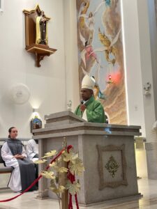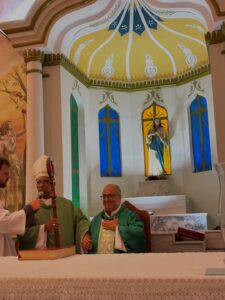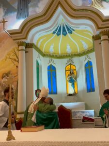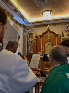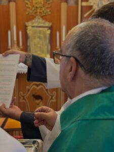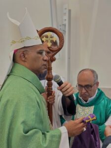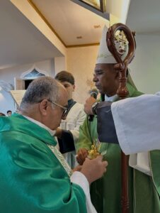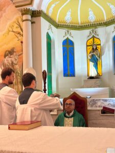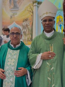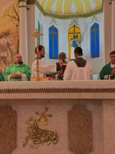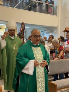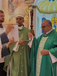 A celebração eucarística, na qual se deu o rito de posse, foi presidida por Dom Pedro Cunha Cruz, que conduziu o momento litúrgico conforme as normas da Igreja. Durante o rito, foram apresentados os principais sinais do ministério pastoral, como a entrega simbólica da chave da igreja, da pia batismal, do sacrário e da sede, expressando a missão confiada ao novo pároco no cuidado do povo de Deus.